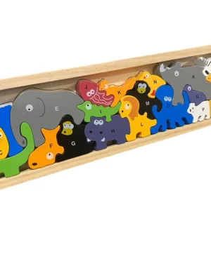 This colorful puzzle introduces A–Z animal names, shapes, and alphabets while developing fine motor skills and problem-solving abilities.